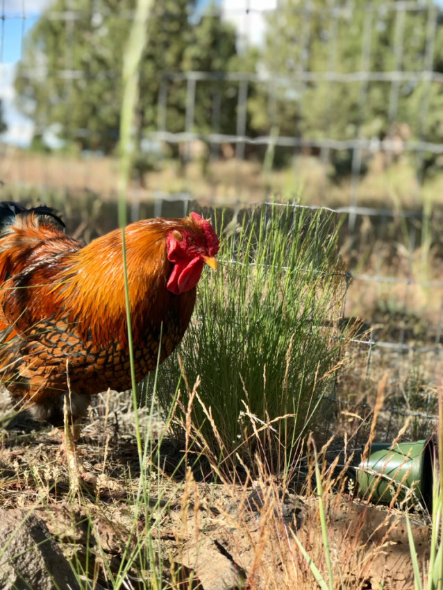 This was news to me. I had no idea that chickens talk so much. It is fascinating to listen to their different noises, which actually mean different things. I remember when we had the hens and Fabio sensed danger. He would make a certain warning noise and they would all go running for cover under a nearby tree. They also make a certain noise when they have found something exciting to eat. We don’t have many snails here in Central Oregon, but one day my son found a snail in a flower pot and he set it down in front of Fabio. Fabio immediately stabbed the poor snail with his beak, started making that “yummy” sound, and continued to eat his escargot. We were stunned at how fast he reacted. I needed a Fabio in my yard when I lived in the Bay Area. We had PLENTY of snails. Fabio also makes a sound while he dances around my son…it’s a sound of affection.